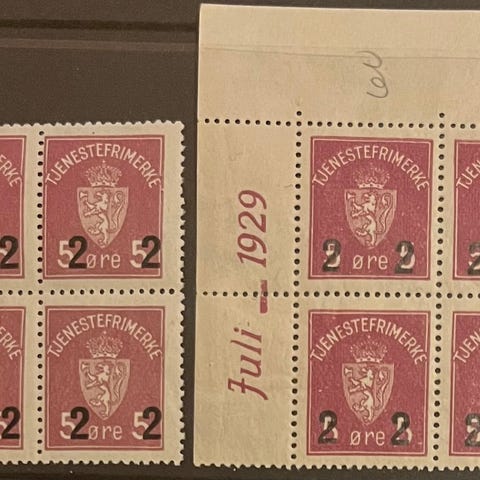 Norge 4-blokker postfrisk, nk Tj. 42 + 43 **, 10 og 20 øre, begge typer