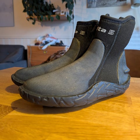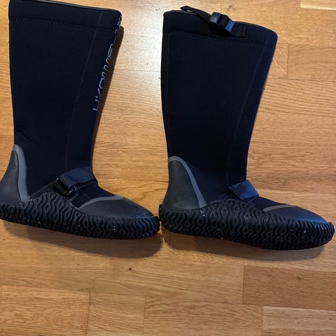 Tørrdrakt fra nemo i god stand. Halsmansjett, og mansjetter til armene er i god stand. Det samme er glidelåsen. Sko i størrelse "noen og 40"- jeg har god plass med læster i
