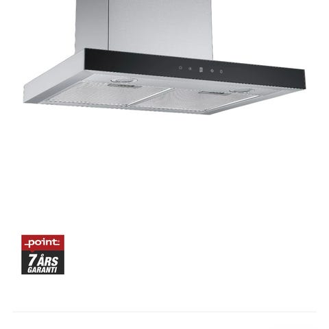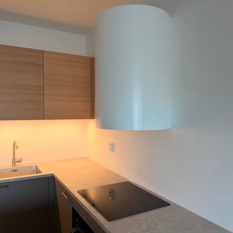 Røroshetta Kjøkkenventilator med integrert skap i hvit Herregård utførelse. Ventilatoren er montert over kokeplate og har innebygd belysning. Skapet over ventilatoren kan åpnes for oppbevaring.
