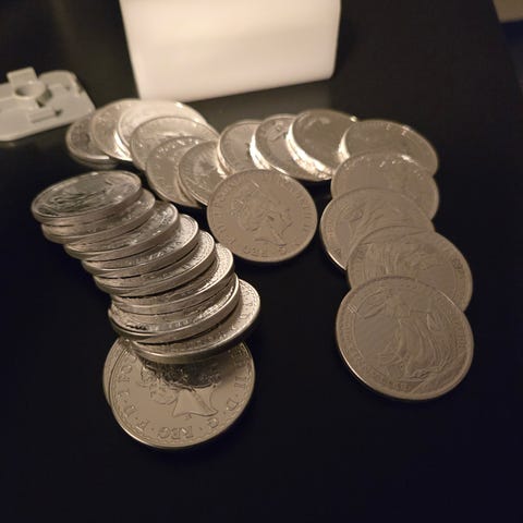 Apmex Sølvmynt 1 oz, 10 stk. Sunshine minting, 10 stk. Kommer i en oppbevaringsboks. Hver mynt veier 1 unse og er egnet for samling eller investering. Kan selges separat uten oppbevaringsboks. 3 av myntene har små milk spots og en har litt sort merke. 1200 kr per mynt. + eventuell porto