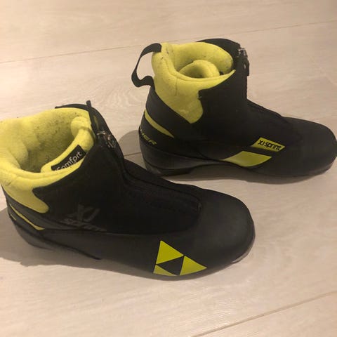 Fischer JR Combi skisko i svart og gul farge. Skiskoene har glidelås foran og gummisåle for godt feste. Støtte rundt ankel. Hele og fine sko. Ny pris 1900kr