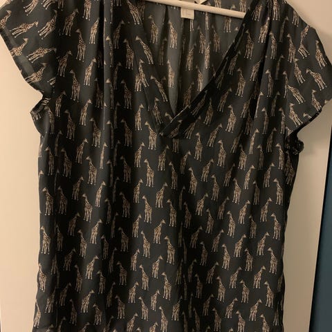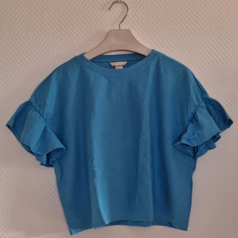 H&M topp i blå farge, størrelse 42. Laget av polyester og foret med nylon. Toppen har kort erm og knyting foran. Veldig fin fasong. Litt liten i størrelsen. Ingen skadar eller manglar.