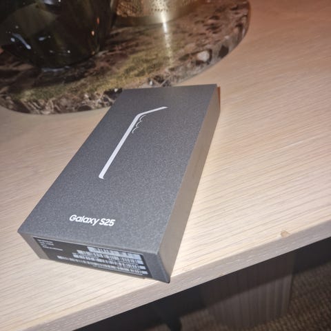Samsung Galaxy S25 mobiltelefon med 128 GB lagringskapasitet.