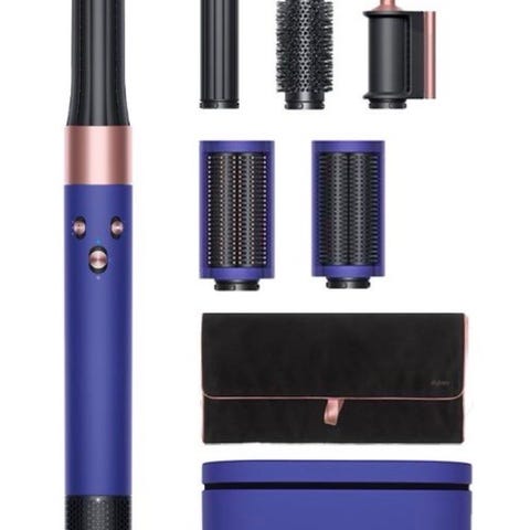 Dyson Airwrap Complete hårstyler sett med flere utbyttbare stylingtilbehør inkludert børster og ruller. Fargekombinasjon blå og kobber. Designet for effektiv hårstyling med varmebeskyttelse og luftstrømsteknologi. Leveres med oppbevaringsboks.