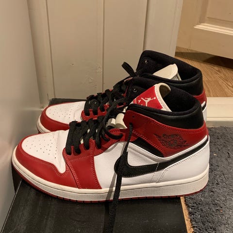 Nike Air Jordan 1 basketballsko i størrelse 40. Skoene har en kombinasjon av oransje og hvit farge. Designet for basketballbruk.