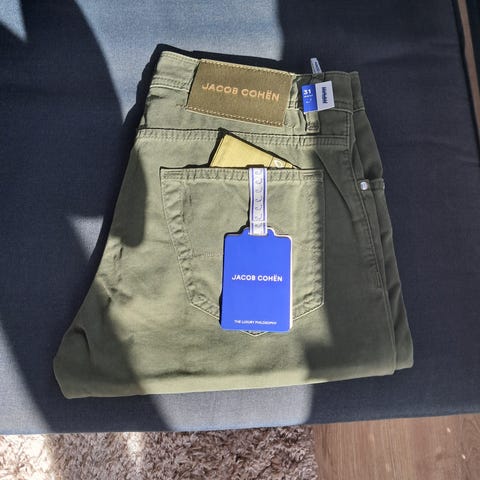 Blå chinos fra Jacob Cohen selges til en rimelig pris. Patchen er helt fin, og buksene er litt farget av, men ikke noe man tenker over når man har de på. De er egentlig i størrelse 32, men siden de er blitt vasket og siden Jacob Cohen ofte er mindre i størrelsene sitter de mer som en 31 både i lengden og bredden. Derfor er de markert som «brukt» og ikke «pent brukt».