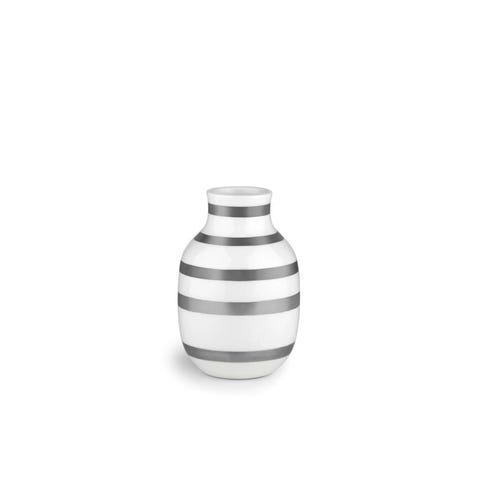 Kähler vase med sølv og hvitt stripemønster. Vasen har en rund form med bred åpning og er dekorert med horisontale striper i sølv og hvitt. Passer til dekorasjon og oppbevaring av blomster.