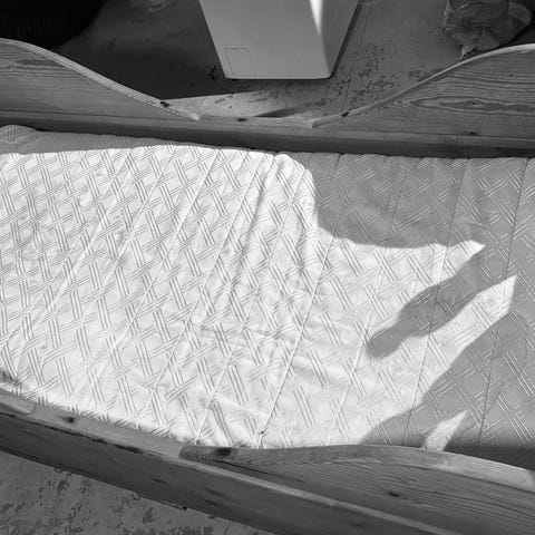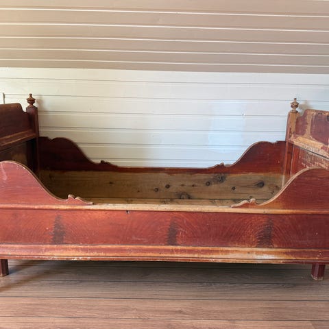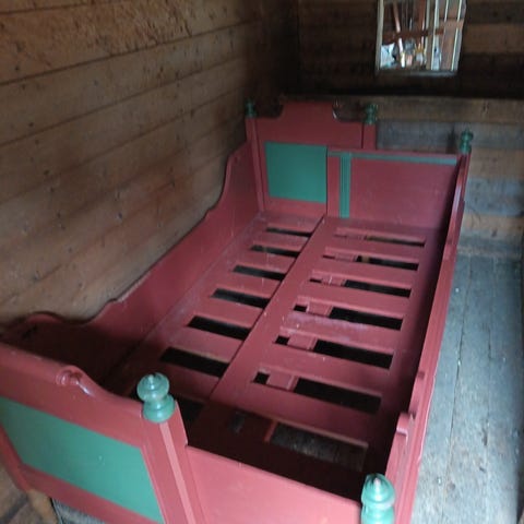 Meget pen blåmalt skuvseng fra 1884 i god stand, 70 til 130 cm utslått