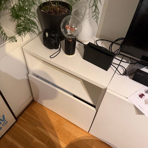 Litt usikker opprinnelse, men trolig IKEA kommode i hvit utførelse med to skuffer og ett skap. Møbelet har ben i tre og en enkel design.