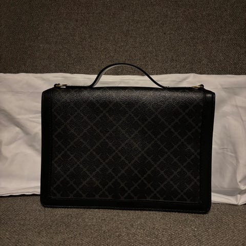 Pent brukt Loennas fra By Malene Birger i fargen «dark chocolate». Loennas er en tidløs og elegant skulderveske designet med merkets signaturprint. Vesken er laget i et slitesterkt materiale og har magnetisk lukking, en sporty, justerbar stropp og to innvendige rom.