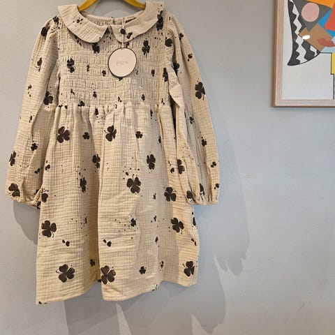 Kjolen kommer i en dyp marineblå farge prydet med søte kontrastrøde hjerter, lange ermer og lekre volangdetaljer ved halsen og ermeåpningene