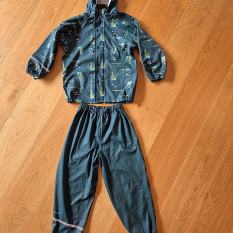 Fint grønt sett med regnbukse og regnjakke, med bjørner på. Hel og fin, men kan godt bytte strikkede under bena.