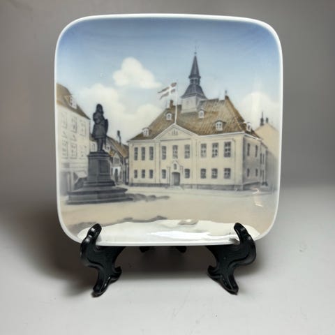 Tre vakre Royal Copenhagen miniatyrfat eller plaquetter. Motivene viser danske landemerker: Dybbøl Mølle, Den Gamle By i Aarhus og Ebeltoft rådhus. Produsert i porselen med klassisk blå og hvit dekor. Hull på baksiden for oppheng.