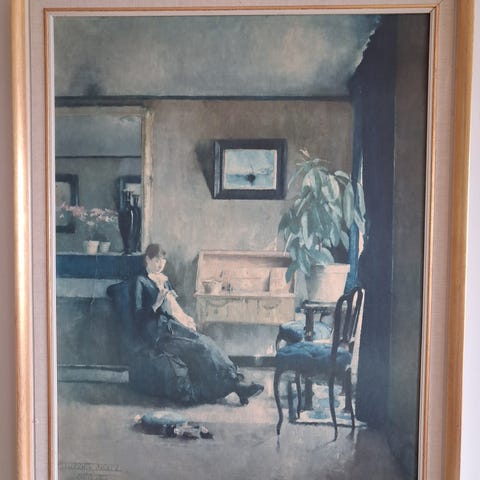 Selger stemningsfullt og tidløst kunsttrykk etter et av Harriet Backers mest kjente og anerkjente motiver. Blått interiør regnes som et hovedverk innen norsk kunsthistorie og er et strålende eksempel på Backers mesterlige bruk av lys, rom og dempede fargetoner.