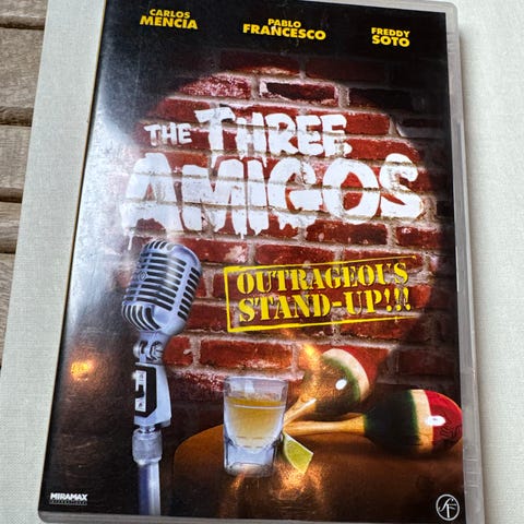 The Three Amigos DVD med filmen Outrageous Stand-Up. Inneholder ekstramateriale og undertekster. Format og språk er ikke spesifisert.