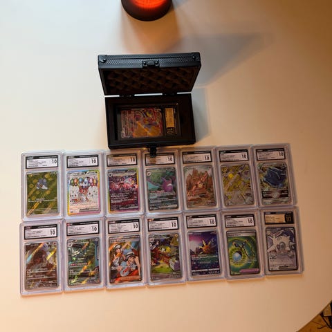 Yu-Gi-Oh! kortspill samling med flere kort i forskjellige størrelser og design. Kortene er lagret i bokser og en oppbevaringseske.