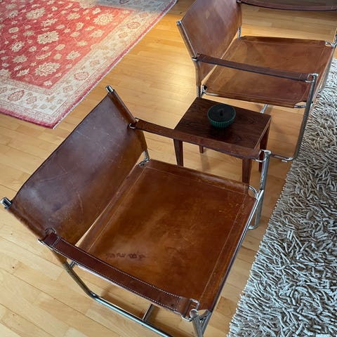 Designikon fra syttitallet I skinn og stål. Stor og komfortabel sittegruppe.