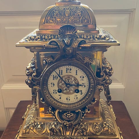 Taffelur i forgylt messing under original glasskuppel, høyde uten kuppel og sokkel 33.5 cm, glasskuppelens høyde med sokkel 40 cm, bredde 35.5 cm