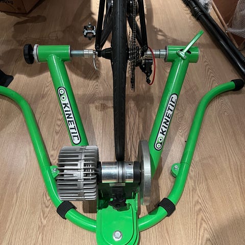 Elite sykkelrulletrener med ramme i metall og justerbar motstand selges. Designet for innendørs trening av sykler, med stabil konstruksjon og mulighet for å tilpasse motstanden for ulike treningsnivåer.