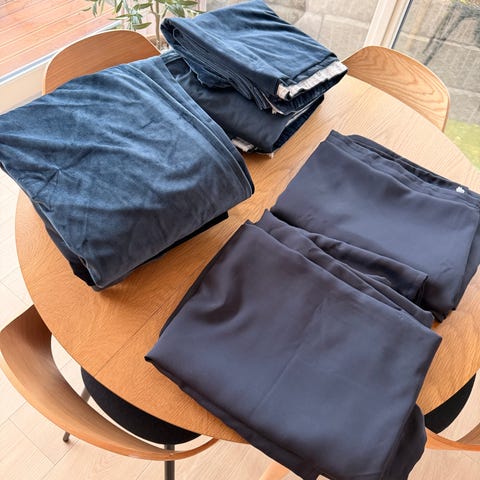 To stk velourgardiner fra Kid. Jeg antar det er Mali. Farge petrol, men mer mot blå.