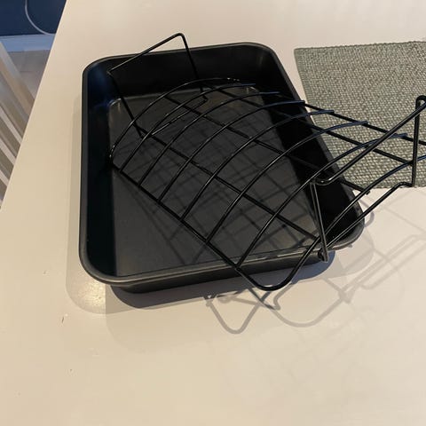 Romslig stekeform, brukt 2-3 ganger, med rist / roaster. God kvalitet.