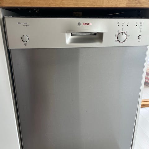 Bosch oppvaskmaskin med standard funksjoner. Enheten har et enkelt kontrollpanel med knapper og dreiebryter for valg av programmer. Innvendig er den laget av rustfritt stål med plass til bestikk og oppvask.