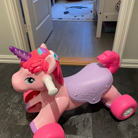 Enhjørning gåbil med lys og lydeffekter, lite brukt. Passer for småbarn