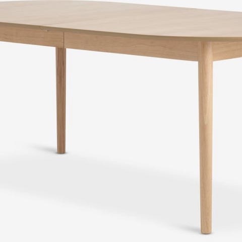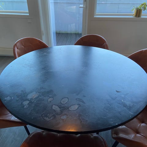 Rundt spisebord med hvit bordplate og ben i tre. Passer til spisestue eller kjøkken. Bordet har en enkel og funksjonell design og ble kjøpt hos Bohus for 4 år siden, men har vært lite i bruk.