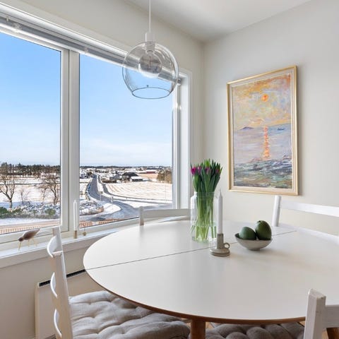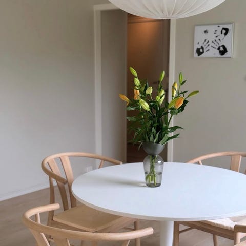 Rundt spisebord med hvit bordplate og ben i tre. Passer til spisestue eller kjøkken. Bordet har en enkel og funksjonell design og ble kjøpt hos Bohus for 5 år siden, men har vært lite i bruk.