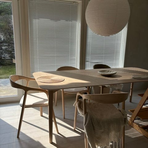 Rundt spisebord lakkert i matt hvit med lyse treben