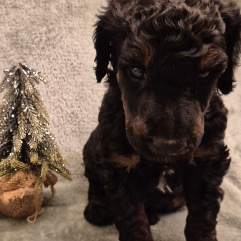 Valpene er født 24. januar og leveringsklare fredag/lørdag i uke 12. Det er ledig både tispe- og hannvalper. Mor er eng. Cocker og far mellompuddel. Begge stambokregistrerte. Alle valpene er sorte, vokser opp på gård og vil oppleve nær kontakt med voksne og barn.