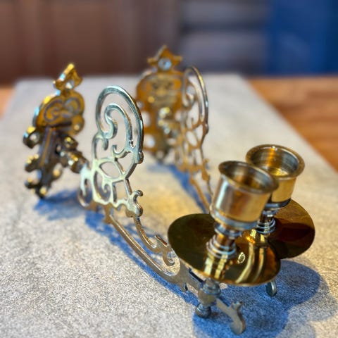 Antikk dobbel lysestake til vegg, dobbel, svingbare ermer, messing