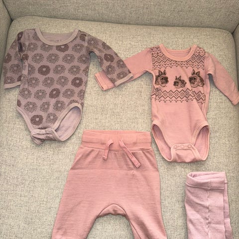 Selger diverse plagg i ull til jente, størrelse 50-56. Pent brukt, men heldressen fra Tom & Trine er litt nuppete.