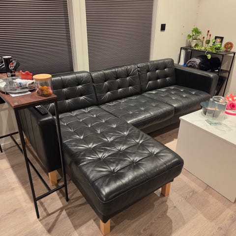 Sofa lengde 190 cm, dybdet 100 cm, høyde opp til 100 cm avhengig av rygg posisjon. Brukt, ingen skader. Består av to deler som settes sammen og kobles elektrisk.