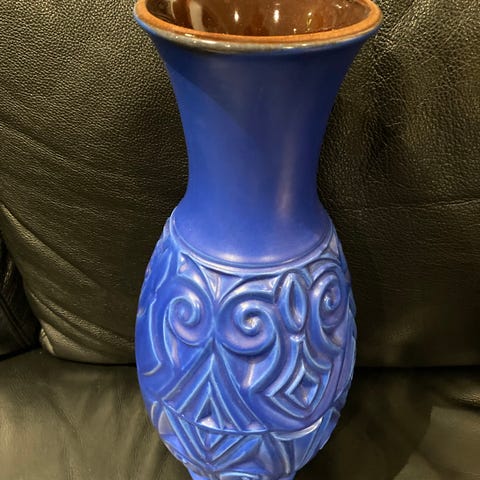 2 gamle blå keramikk vaser med dekorative mønstre selges samlet.