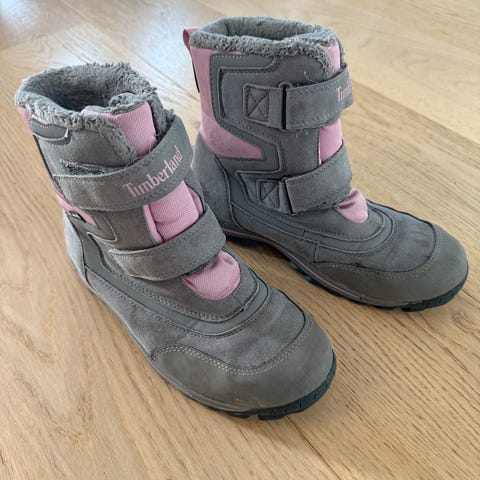 Timberland vinterstøvler i størrelse 37. Grå og rosa. Gore-tex, mykt fôr, og mønstret yttersåle som gir godt grep. Borrelås som gjør skoen enkel å ta på/av.
