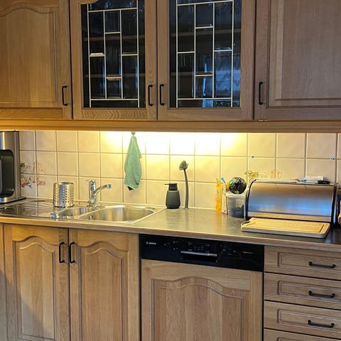 Kjøkkeninnredning fra 2004 i tre med skap, skuffer og benkeplate. Inkluderer komfyr med kokeplater, oppvaskmaskin og kjøleskap. Kjøkkenet har en liten benk for ekstra arbeidsplass. Må hentes og demonteres på egenhånd.