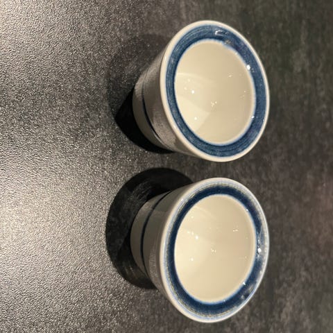 Skålene har en rund form og er laget av keramisk materiale.