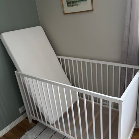 Hvit sprinkelseng klar for nye barn. Vasket overmadrass følger med hvis ønskelig. Samme gjelder madrass og kantbeskytter som hindrer at smokken faller ned.