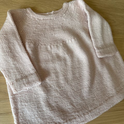 Strikket i tynn merinoull fra Sandnes garn i lys gulgrønn farge (utgått).