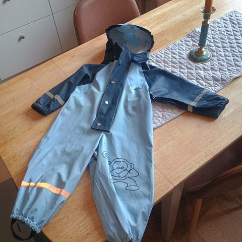 Regndress foret med fleece. Avtagbar hette. Solide gummistrikker til under foten. Litt slitasje i baken som kan fikses.