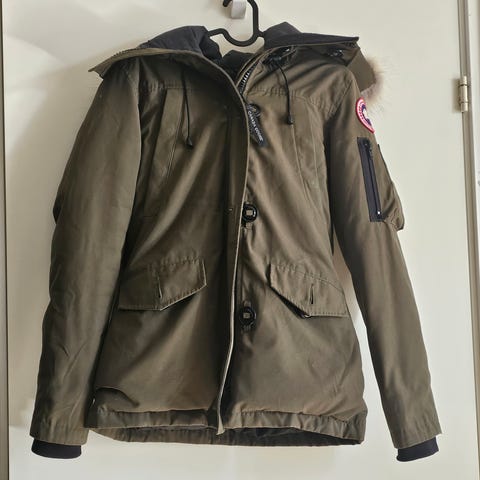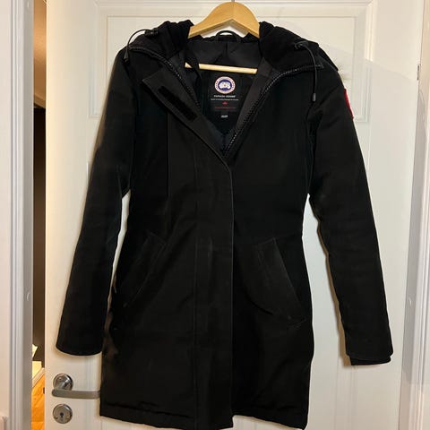 Selger en klassisk og varm vinterjakke fra Canada Goose. Tidløs modell i svart med pelskant på hetten og god passform.