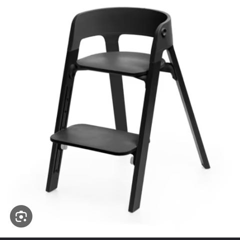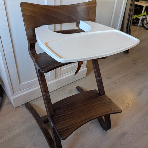 Leander høy barnestol i svart farge. Stolen har justerbar sitte- og fotplate for tilpasning etter barnets størrelse.