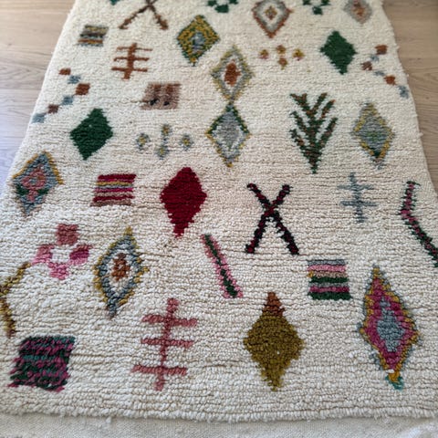 H&M Home teppe med et flerfarget prikkemønster på lys bakgrunn. Teppe har frynser på kortendene og passer godt på barnerom.