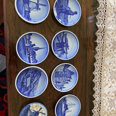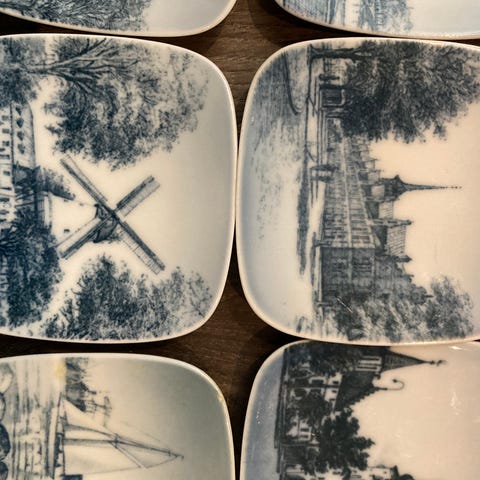 Bing&Grøndahl 6 små firkantede miniplatter/skåler med dekorative motiver i blått på hvit porselen. Miniplattene har ulike landskap og bygninger som motiv. 8x8cm. Gamle og fine. Oppgitt pris er for alle plattene samlet.