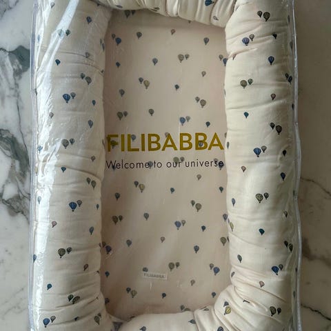 Filibabba babynest med luftballonger. Kjøpt nytt i 2023, pent brukt av to barn. Trekket kan tas av og vaskes
