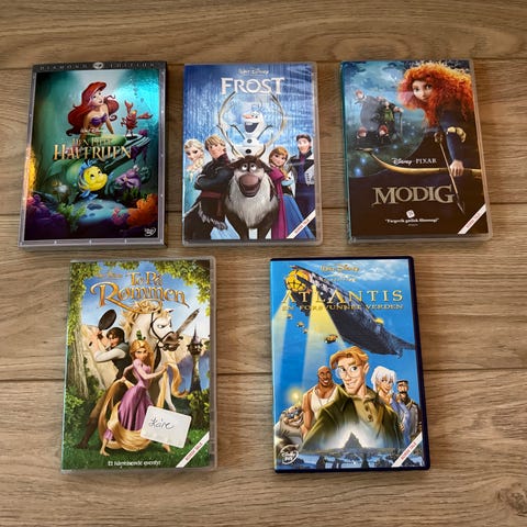 Disney DVD filmer inkludert Mens vi venter, Den lille havfruen, Modig, Jungelboken 2, og Ringeren i Notre Dame. Filmer for barn og familie, med ulike eventyr og animasjonsstiler.