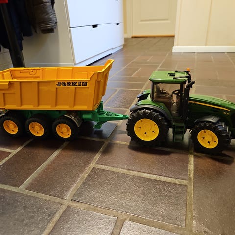 Bruder traktor med tilhenger i grønn og gul farge. Tilhengeren kan festes bak traktoren. Mulighet for styring av forhjulene.