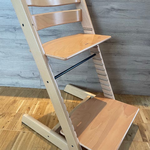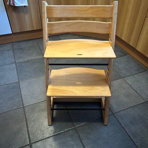 Tripp trapp stol som er brukt mye, men i teknisk veldig god stand. Den har hatt farge tidligere, men er pusset ned. Treverket er sånn sett ubehandlet.