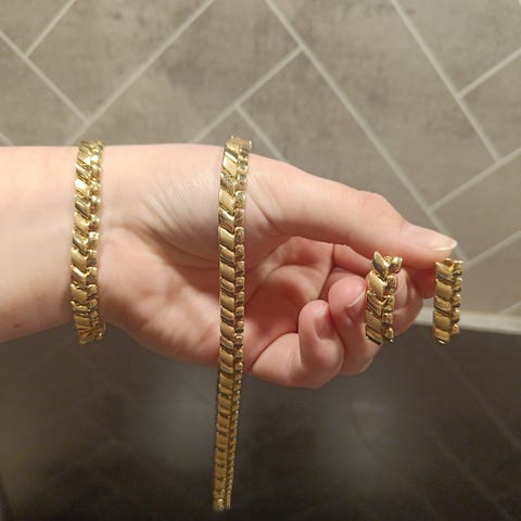 Gull sett inkludert en kjede,et anheng med naturlig smaragd og en ring